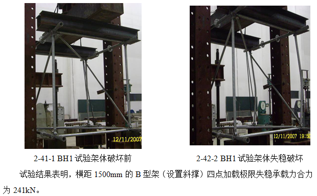 1、横距1500mm的B型架(设置斜撑)四点加载极xian失稳承载力合力为241kN。