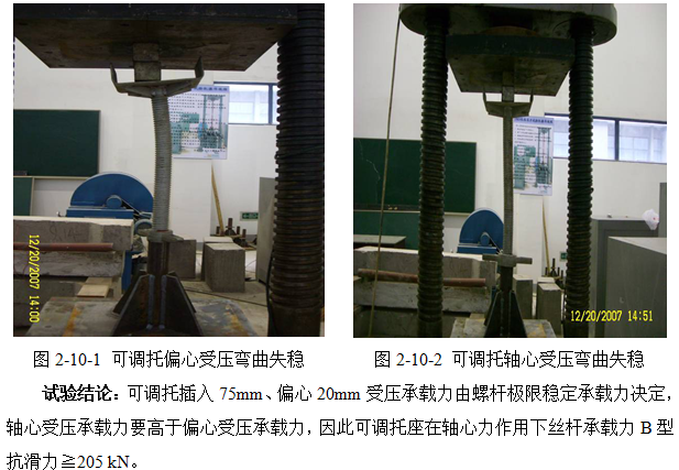 2、偏心及轴心集中力作用下,可调托丝牙未见明显滑移,丝杆弯曲失稳破坏。B型可调托座及底座抗滑移力≥205KN